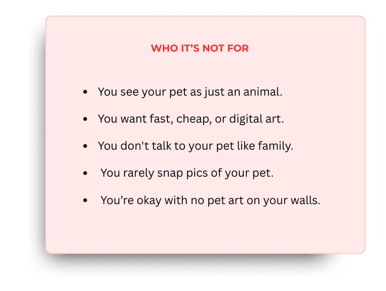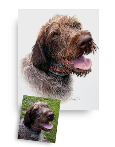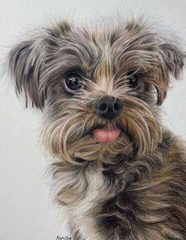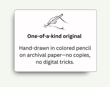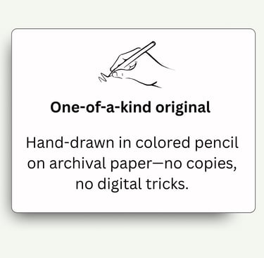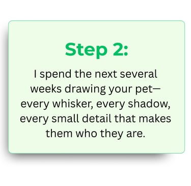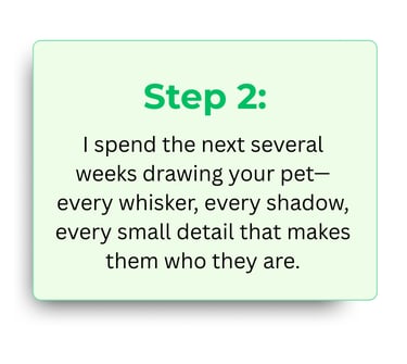 It starts with you sharing photos and stories about your pet—we'll chat to get the details right. I spend 40+ hours hand-drawing in colored pencil, sending progress updates so you feel involved. Then I ship it safely to you.