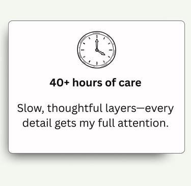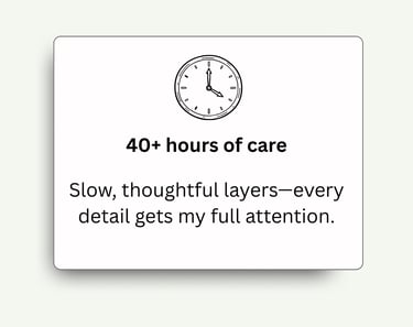 Usually 4–6 weeks from our first chat to delivery. With only 4 spots per month, I can focus fully on each one. Let me know if timing matters (like for a special date), and we'll work around it.