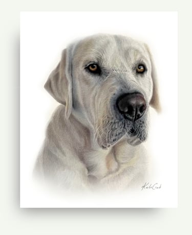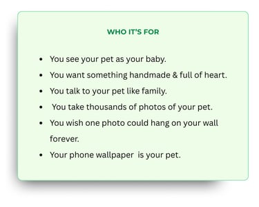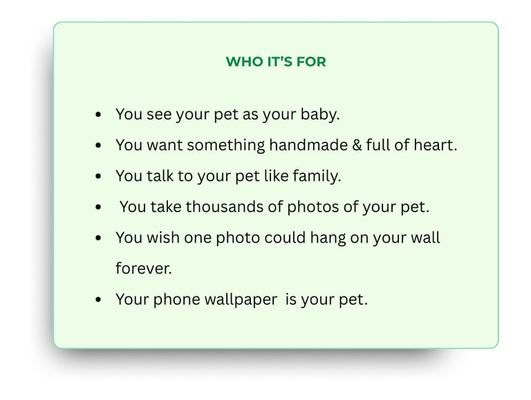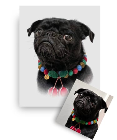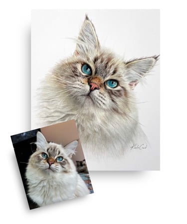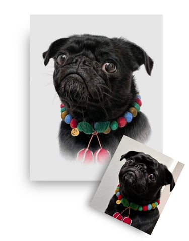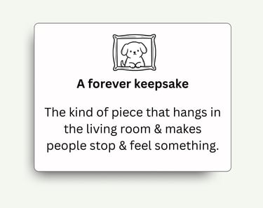 I work from your favorite photo—the one you keep coming back to—and I draw what the camera caught but couldn't quite hold: the tilt of their head, the softness around their eyes, the way their fur catches light.