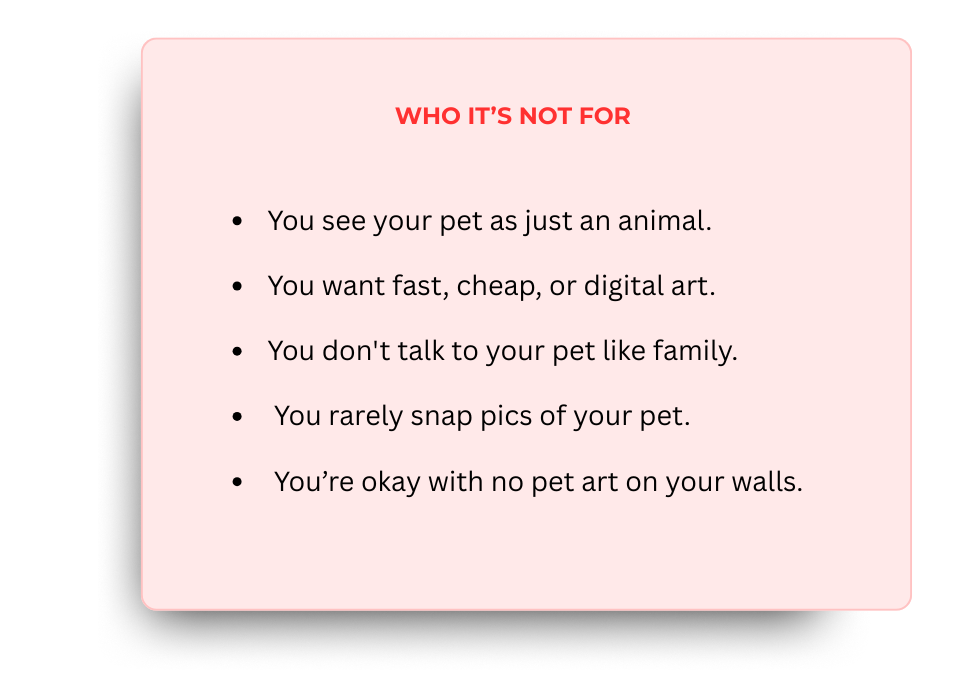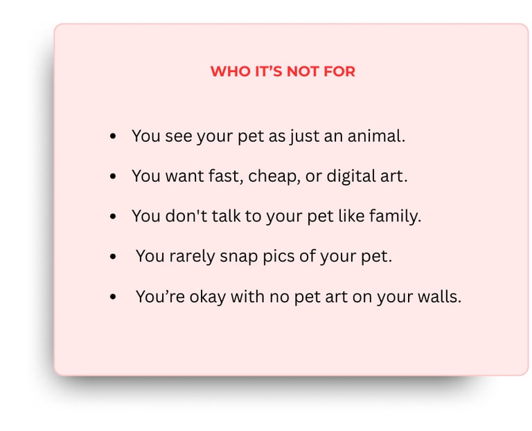 I work from your favorite photo—the one you keep coming back to—and I draw what the camera caught but couldn't quite hold: the tilt of their head, the softness around their eyes, the way their fur catches light.