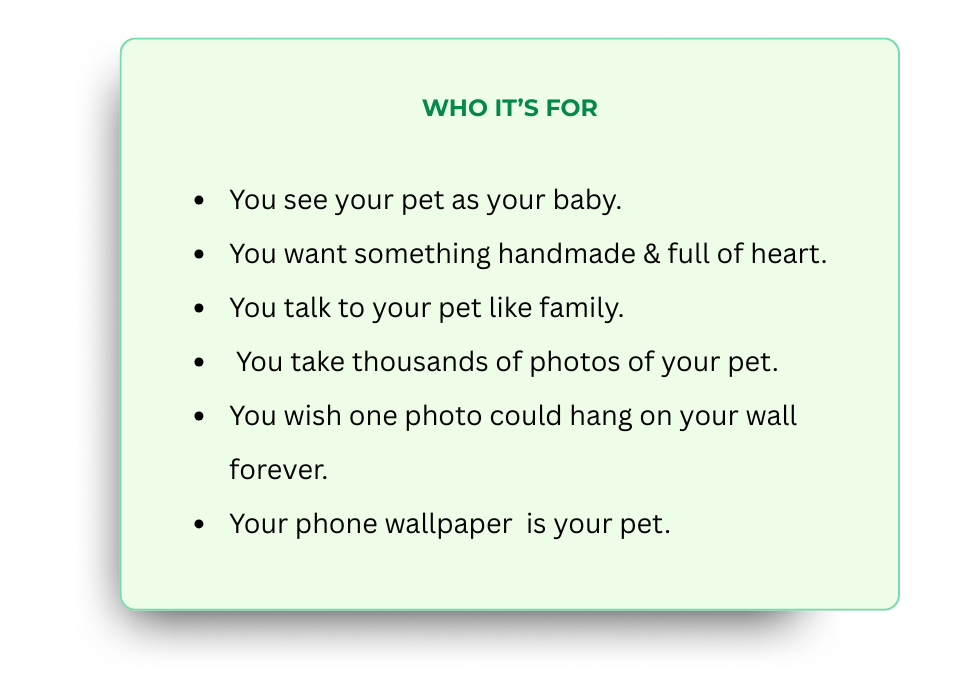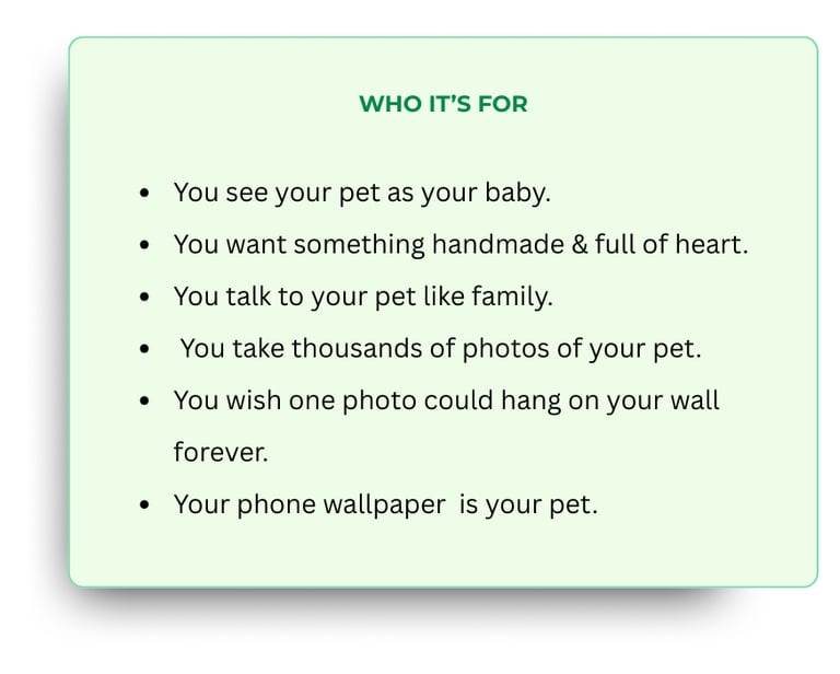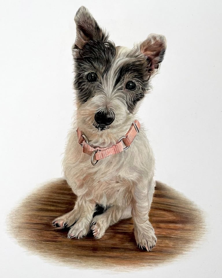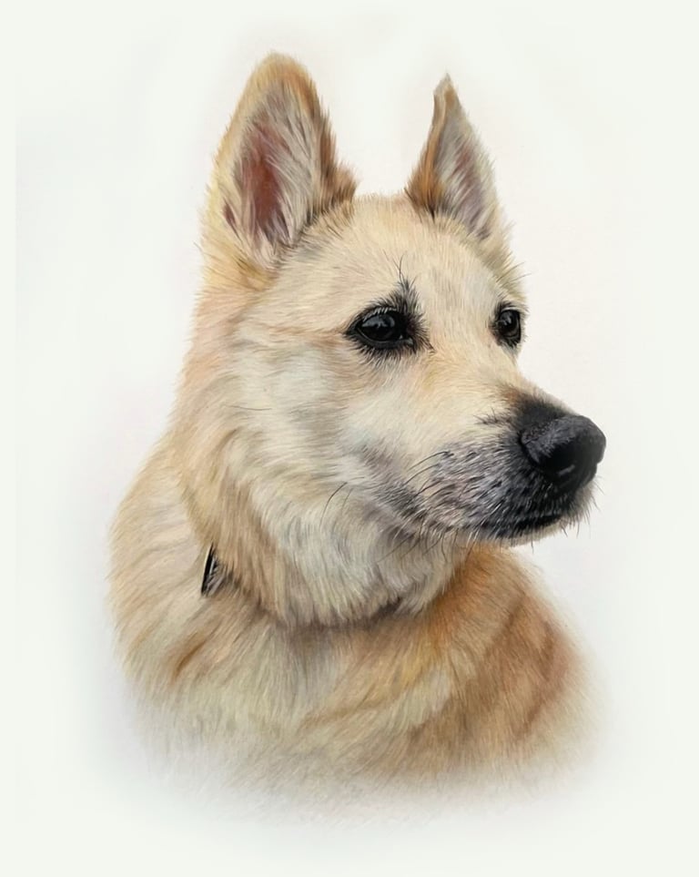 It starts with you sharing photos and stories about your pet—we'll chat to get the details right. I spend 40+ hours hand-drawing in colored pencil, sending progress updates so you feel involved. Then I ship it safely to you.